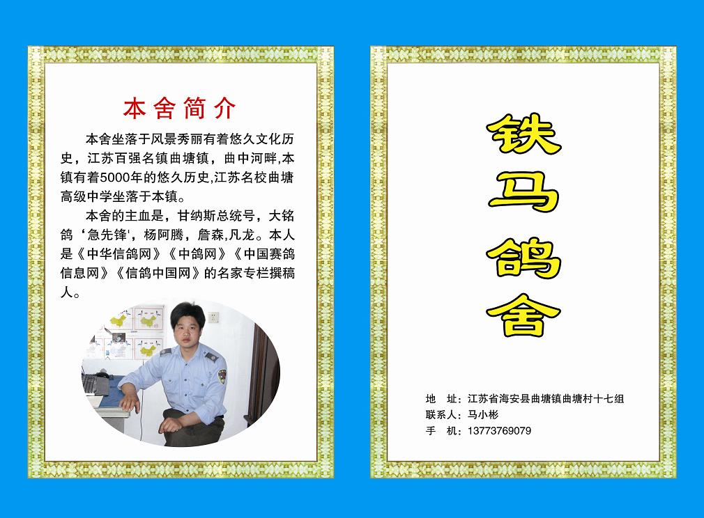 本舍坐落于风景优美,有着悠久文化历史的全国文明镇、国家卫生镇、江苏省强镇扩权试点镇,江苏省书香之镇、南通市重点中心镇第一镇---曲塘镇。本舍的主血是,鹿影金雄子代,甘纳斯总统号,盖比,罗马,扑克斯曼,泰山系,詹森断胸骨子代,瓦特,威廉吉尔特,上海吴淞鸟优秀长途血统。本人是《中华信鸽网》《中国赛鸽信息网》《信鸽中国网》的名家专栏撰稿人. 本人是西安格莱德鸽药南通地区独家总代理,主要经营西安心连心鸽药,上海龙园鸽药,北京鹏翔鸽药,台湾通威鸽药等 。 鸽药淘宝店,欢迎鸽友们光临。 http://shop63318432.taobao.com(格莱德鸽药南通代理)