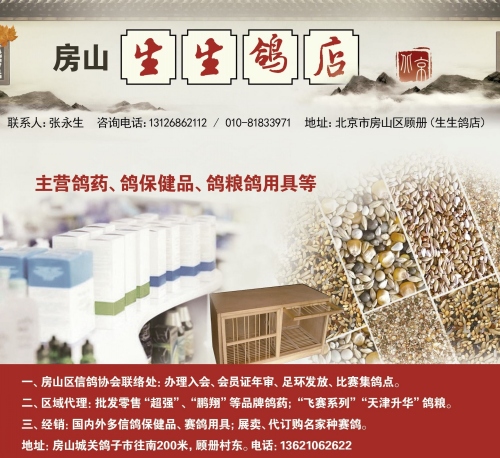 有了好的种鸽加上科学的理念,可以近似成功! 能拥有志同道合的朋友可享受赛鸽的乐趣! 北京房山生生鸽店--开业十年,为鸽友提供货真价实的信鸽用品、种鸽、及用药指导! 联系电话:13126862112
