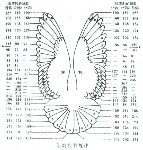 图4—2是一羽3月龄鸽子的换羽次序。每一号码右侧的数字所显示的是鸽子出壳之后相应的羽毛的更换天数。从图4—2中可看出,只有羽翼才从1至10依次更换。 鸽子换羽有两个时期。