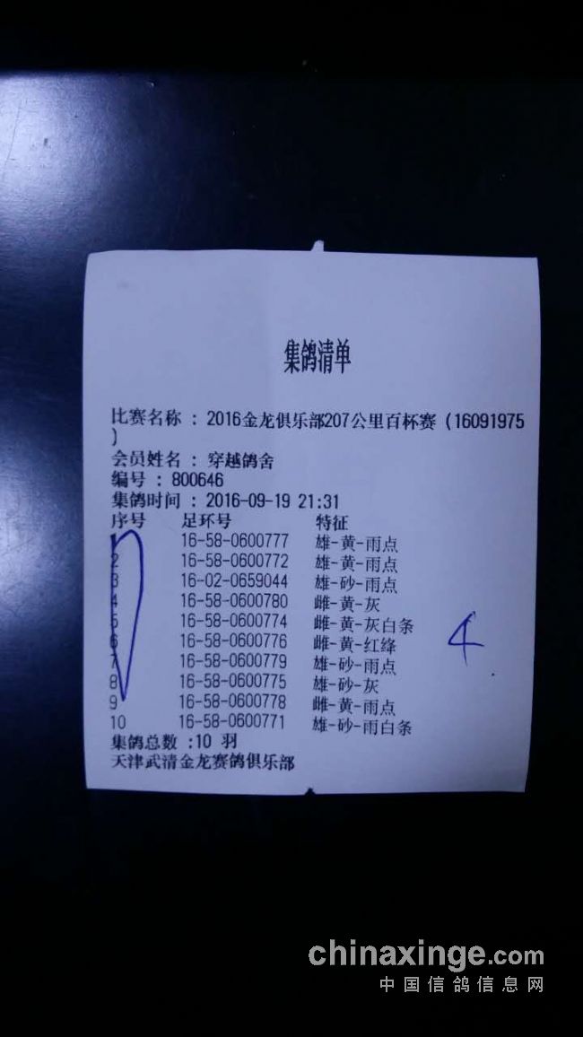 亚军;穿越鸽舍 A组4羽,最好成绩19名