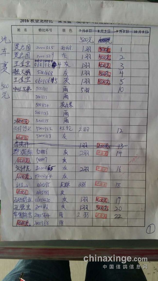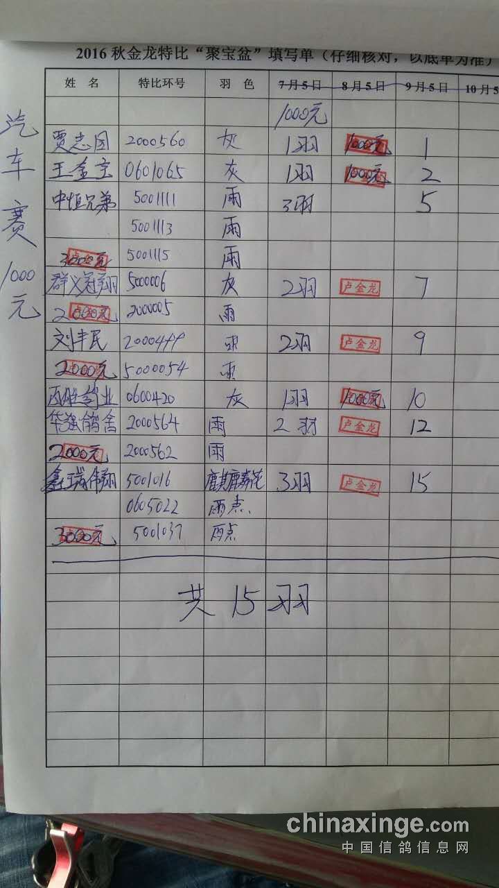 共计15羽 冠军;13500元