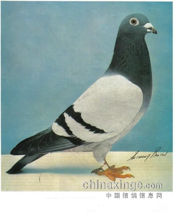 (这羽生于1973年的漂亮灰雌为塞锐维尔斯夺得1977年拿邦国际赛全英国冠军,而作为青年鸽它曾经夺得法国雷恩赛大区17名、全英60名,一岁鸽休息一年未出赛,2岁时使翔到580公里,接着完成法国南特赛和波城国际赛,1977年问鼎拿邦前它还夺得南特赛荣誉。它的父亲源自亨利斯瑞的老洛根,母亲则是维尔斯最优秀的一羽两次波城大赛入赏母鸽。注意看她那完美修长的身材和主羽!)
